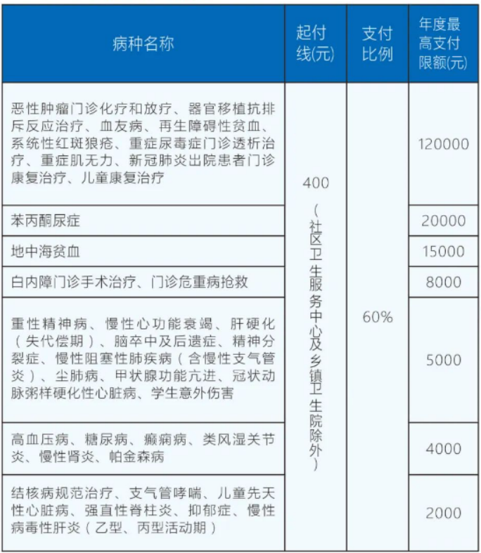 一個(gè)參保年度內(nèi),城鄉(xiāng)居民醫(yī)保參保人員因患大病發(fā)生的個(gè)人負(fù)擔(dān)的醫(yī)保目錄內(nèi)住院及門診特殊病種醫(yī)療費(fèi)用,超過19360元部分,保額30萬元,10萬以內(nèi)賠付比例70%、10萬至30萬賠付比例80%。