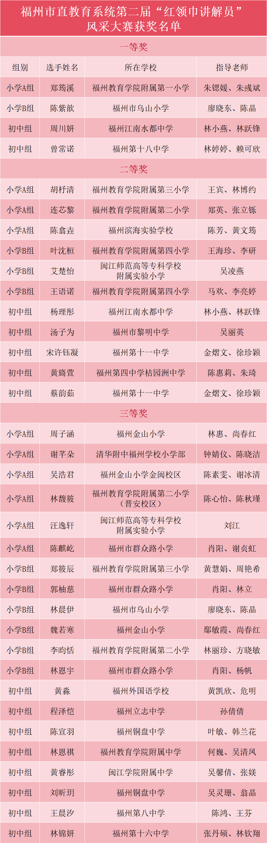 近日,由共青團福州市教育局委員會主辦、福州教育學(xué)院附屬第三小學(xué)協(xié)辦的福州市直教育系統(tǒng)第二屆 “紅領(lǐng)巾講解員” 大賽收官。賽事面向市直(含在榕省屬)教育系統(tǒng)全體少先隊員,設(shè)初賽、研學(xué)、決賽三個環(huán)節(jié),旨在通過“以賽促學(xué)”的方式,為少先隊員搭建展示綜合素養(yǎng)的舞臺,引導(dǎo)青少年厚植愛國情懷、增強文化自信,讓更多少先隊員用聲音傳遞力量,全方位挖掘和培養(yǎng)優(yōu)秀“紅領(lǐng)巾講解員”。