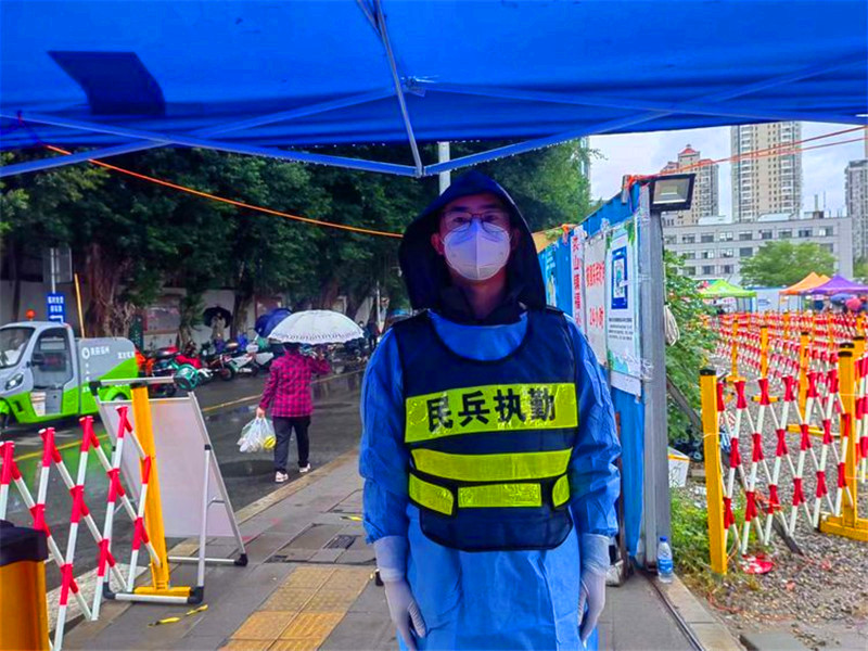疫情一開始,他就作為全辦年齡最大的下沉社區(qū)干部活躍在鼓樓旗汛口社區(qū)、臺江福人社區(qū)助力疫情防控工作。隨著疫情形勢嚴(yán)峻,他被安排到更重要的崗位,下沉閩侯縣祥謙鎮(zhèn)擔(dān)任市人防辦疫情防控第二小分隊(duì)臨時(shí)黨支部委員;每天清晨天還未亮,他就在村核酸檢測現(xiàn)場引導(dǎo)村民有序進(jìn)行核酸檢測;忙完核酸檢測工作后,又馬不停蹄地趕往村口值守。他發(fā)揚(yáng)不怕辛勞、連續(xù)作戰(zhàn)的作風(fēng),在掃樓清戶排查中不留死角,做到負(fù)責(zé)區(qū)域全覆蓋;他擔(dān)心村民們對疫情不夠重視,用大喇叭為村民廣播,用順口溜等群眾喜聞樂見的方式分享一些實(shí)用的疫情防控小知識,引導(dǎo)村民進(jìn)行科學(xué)防護(hù),提高防護(hù)意識。由于站立時(shí)間過長,他腰肌勞損的“老毛病”又犯了,晚上睡覺痛得無法翻身,隊(duì)友們勸他暫停工作回家休息,但他堅(jiān)決不肯,表示軍人的本色是輕傷不下火線,仍然連續(xù)7天堅(jiān)守在抗疫一線,每天一站就是10余個(gè)小時(shí),與隊(duì)友們共同為雙龍村筑起疫情防控的堅(jiān)固防線。直到11月10日第二小分隊(duì)轉(zhuǎn)戰(zhàn)晉安區(qū)新店鎮(zhèn)參與“無疫小區(qū)”建設(shè),在組織的要求和安排下才回到福州就醫(yī)休息。