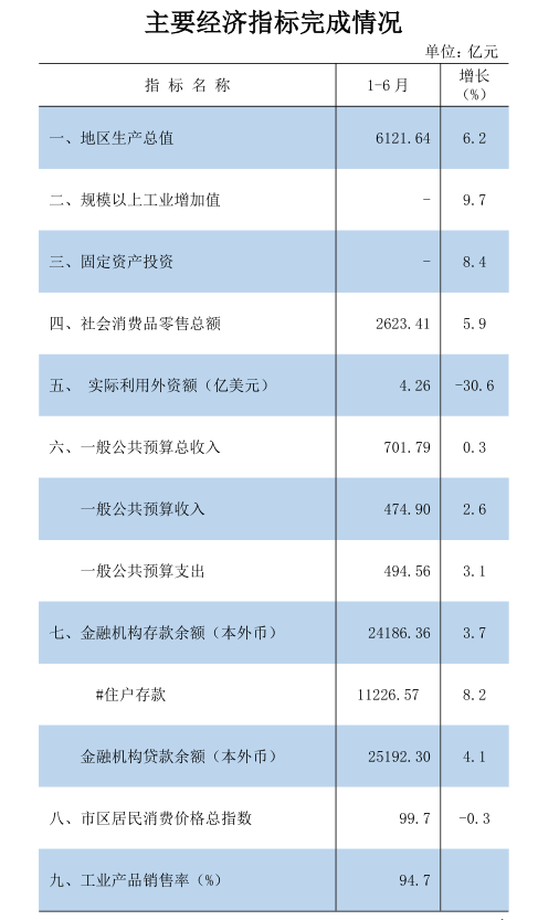 2024年1-6月主要經濟指標完成情況