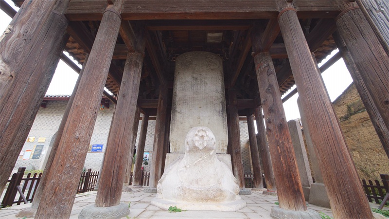 御碑亭高7米有余,由十六根木柱子支架而起,柱子的底座是具有北方建筑特色的石雕蓮花瓣,亭上蓋著青色小瓦,亭子的四角雕飾著蚩吻獸頭。亭子是為亭內的龜趺而建,龜趺為石灰巖質,座高1.9米,長4米,寬2.5米。