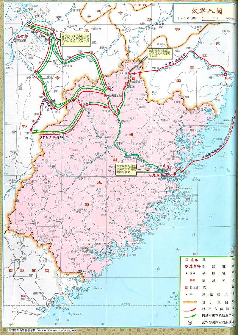 第一路。由橫海將軍韓說率領水師。從會稽郡句章(今浙江寧波)附近出發。渡海南行。直趨東冶。截斷閩越軍海上退路,進而登陸,溯閩江而上合擊閩北。