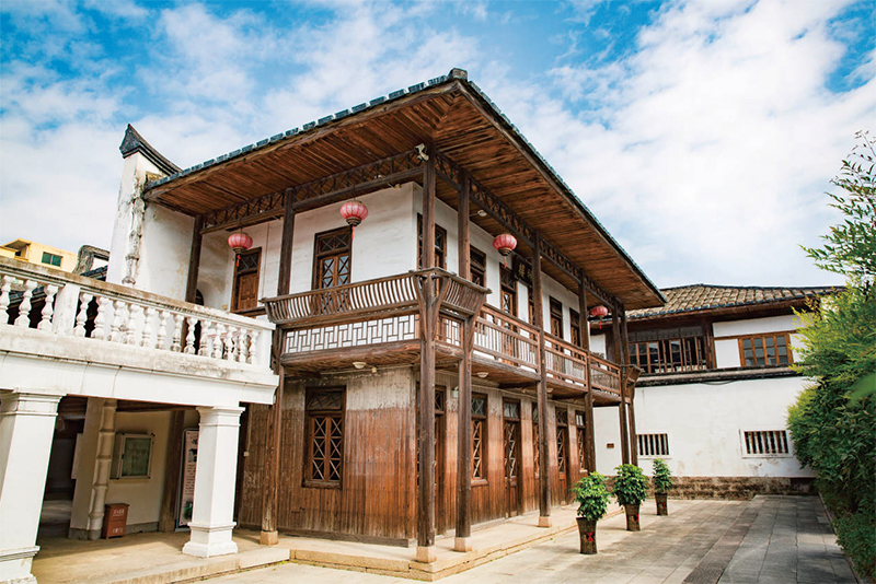 晞樓與還讀樓毗鄰而建,樓名取“晞以朝陽”之意,是陳寶琛晚年一家觀日賞月之所。晞樓是五樓中唯一的一座西風建筑,主體為一棟石木雙層小樓,與還讀樓東面山墻相連。小樓整體風格利落規整,廊道內“品”字門窗開設間距均勻、制式統一,窗格平欞裝飾簡約。樓西南側后方建有方形歐式露臺與二層廊道相連,水泥澆筑、通體粉白。露臺柱式造型整體呈現方圓結合的西式美感。