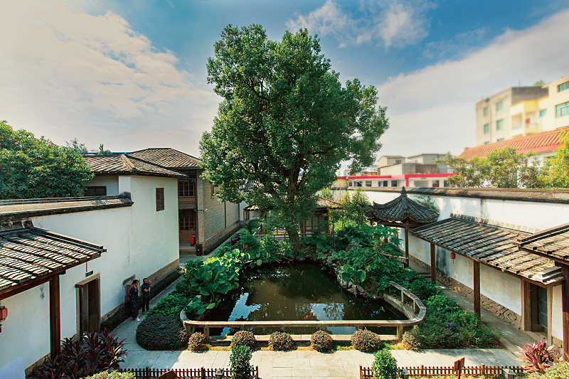 繞過主屋中堂,穿過后堂跨院院墻,便到第三進庭院,即祖宅后院。這里曾是陳景亮、陳承裘、陳寶琛祖孫三代居住生活的主要場所,也是賜書樓營建之處。較之前院,第三進后院尤顯寬綽疏朗,花園式天井兩側有花廳、廂房,由披榭抄手連通至賜書樓。天井內沿南北中軸鋪設石埕大道,寓意前程遠大。大道兩側植有綠茵花木,架設石案汀步,嫣然愜意,東北角花木掩映間有一口古井,寓意錦上添花。
