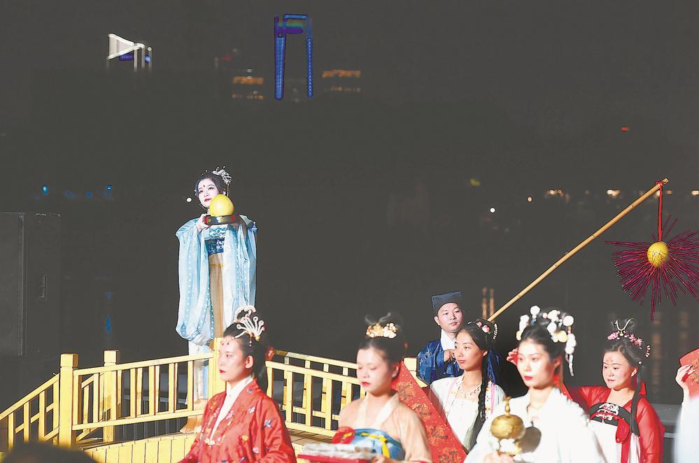 9日中秋前夜,“秀閩江 福滿倉”倉山區閩江之心系列活動——閩江之心月正圓主題晚會舉行。晚會濃縮了閩都中秋傳統文化精華,為市民營造了濃厚的節日氛圍。圖為傳統祭月禮表演。本報記者 游慶輝 攝