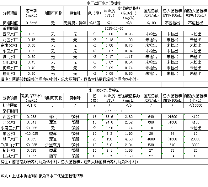 2025年11月30日供水水質信息發布