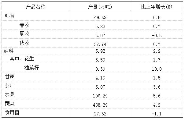 全年農林牧漁業總產值1235.28億元,比上年增長4.1%。糧食種植面積8.73萬公頃,比上年增加0.06萬公頃。糧食產量49.63萬噸,比上年增加0.26萬噸,增長0.5%。其中,稻谷產量24.04萬噸,減少0.06萬噸,下降0.2%。