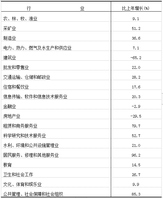 全年規模以上工業的35個行業大類中有19個增加值實現正增長。其中,化學原料和化學制品制造業增長39.6%,黑色金屬冶煉和壓延加工業制造業增長14.0%,電氣機械和器材制造業增長8.8%,電力、熱力生產和供應業增長5.9%,汽車制造業增長2.3%,非金屬礦物制品業增長1.0%。高技術制造業增加值下降4.0%。裝備制造業增加值下降0.7%。