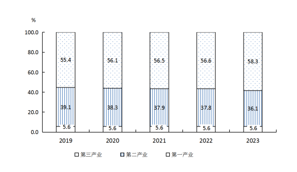 圖2 2019-2023年三次產業增加值占地區生產總值比重