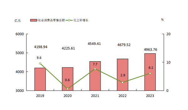 圖5 2019-2023年社會消費品零售總額及其增長速度