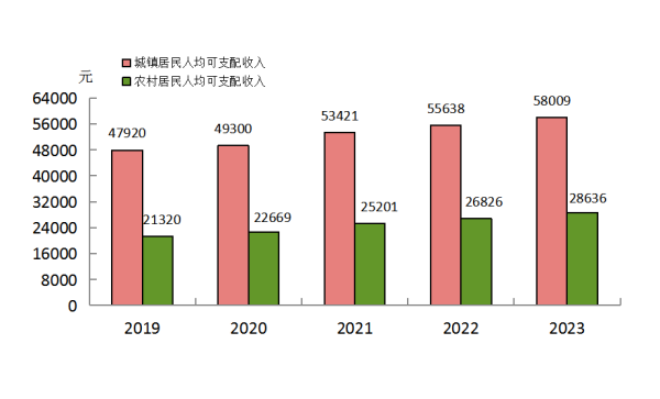全年居民人均可支配收入48861元,比上年增長5.3%。按常住地分,農村居民人均可支配收入28636元,增長6.7%;城鎮居民人均可支配收入58009元,增長4.3%。