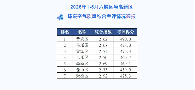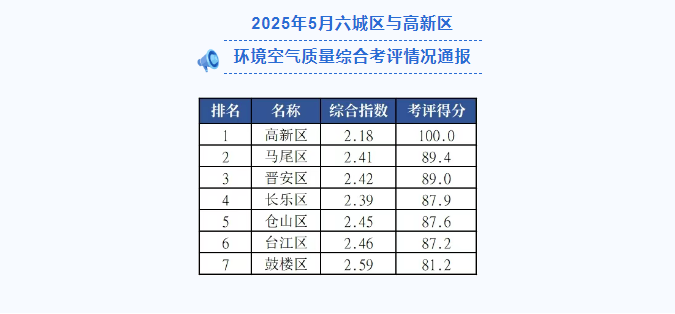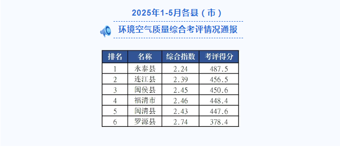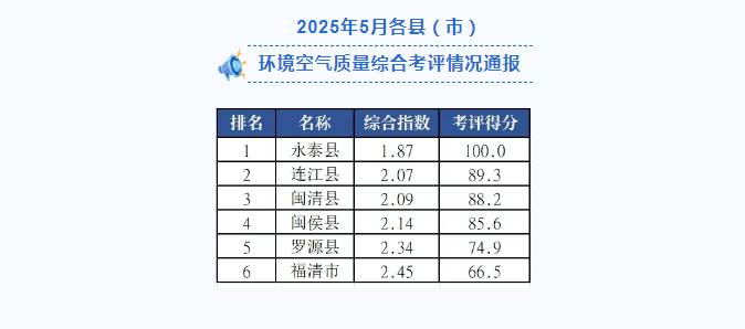 福州市2025年5月及1-5月各縣(市)區(qū)環(huán)境空氣質(zhì)量排名出爐