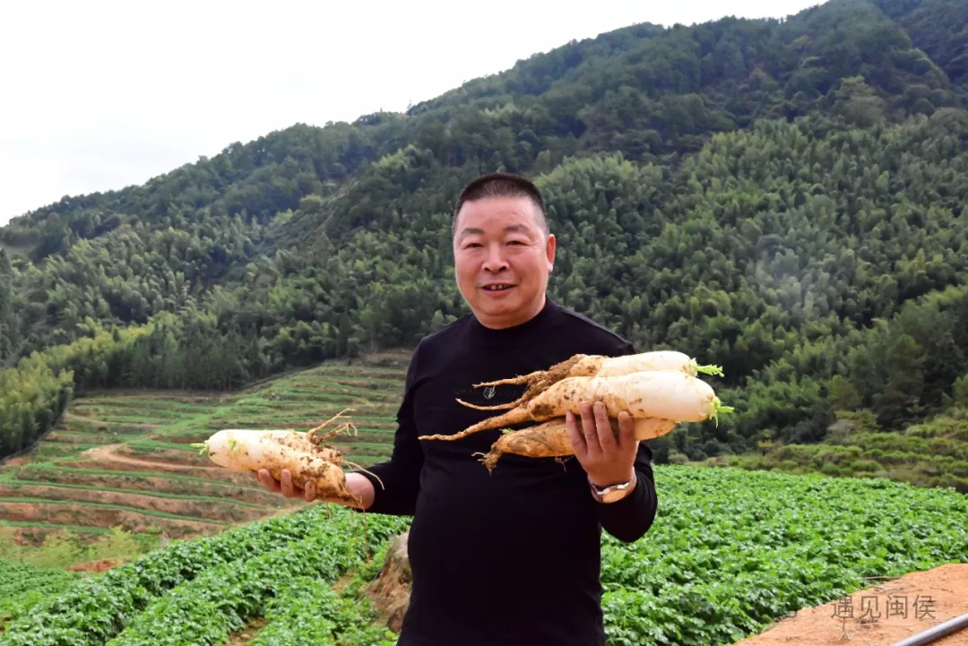 林立平舉起即將豐收的白蘿卜。圖源:遇見閩侯