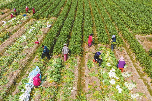 洋西村合作社大頭菜種植地內(nèi),村民忙著采收大頭菜。(連融媒供圖)